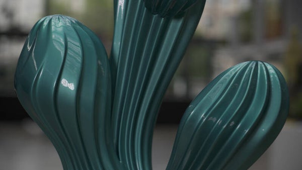 The sculpture is made of resin, and the removable base is crafted from metal.